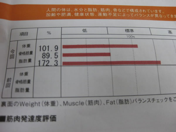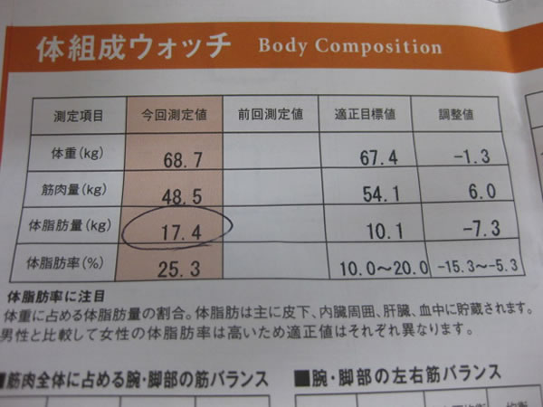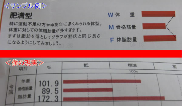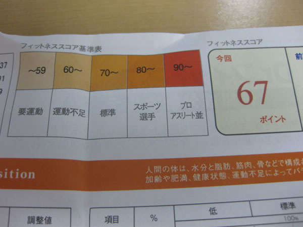 筋肉は無いし、体脂肪は多すぎて、担当官にボールペンで丸付けられちゃうし、なんてったて総合評価が67ポイントだかんね☆