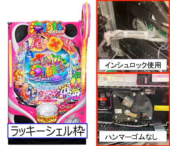 最新のラッキーシェル枠になりコードロッドがイルミオ枠以前で使われていた“インシュロックを用いて固定する”が再び使用されるようになりました。今後、ラッキーシェル枠以外の三洋・サンスリー製新枠にて再び“インシュロックを用いて固定する”ものが使用されるようになることが予想されますため、部品交換の際には間違いのないようご注意ください。